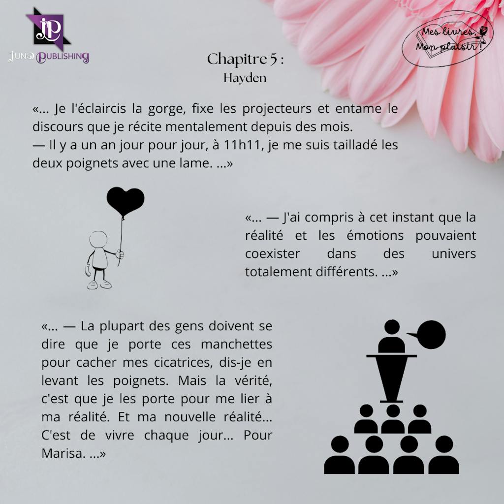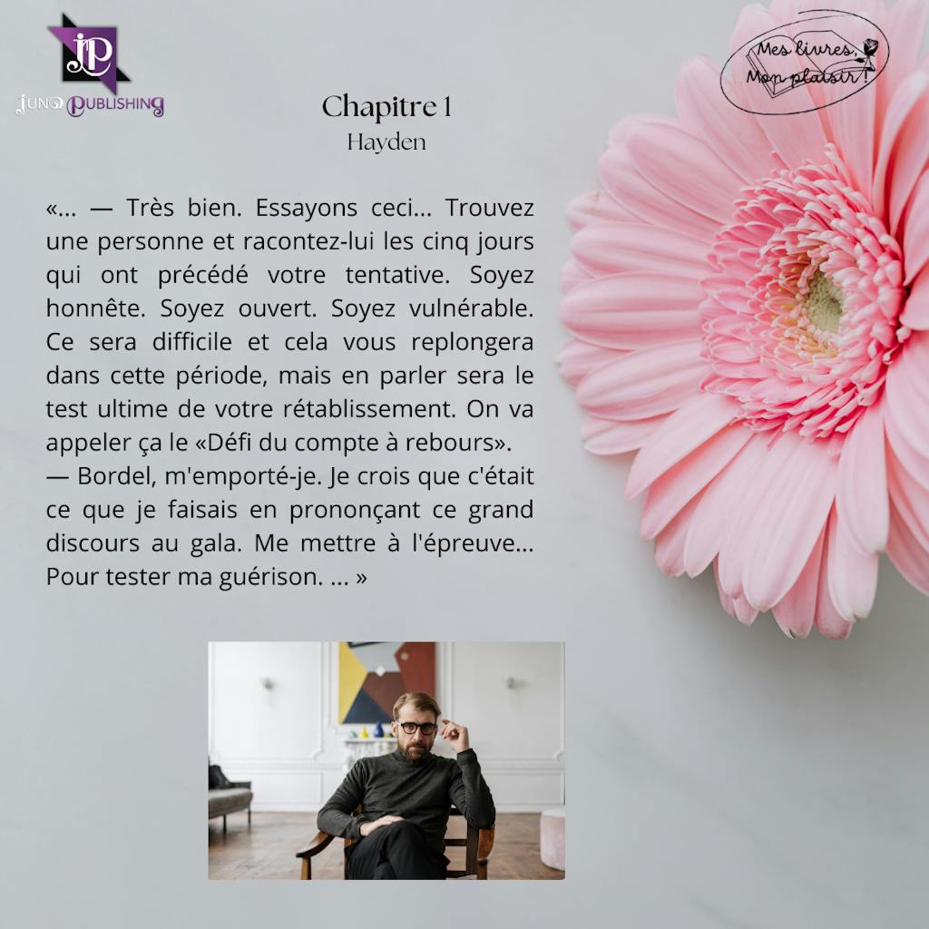 Un an après son moment de faiblesse, Hayden peut marquer une étape en parlant de son histoire, lors d'un gala de charité. Il lui reste une étape mise en place par son docteur, trouver une personne à qui parler de son histoire. Vi l'attire, l'intrigue depuis leur première rencontre. Un baiser, et elle devient son défi, son compte à rebours sur cinq jours avant ce moment fatidique...