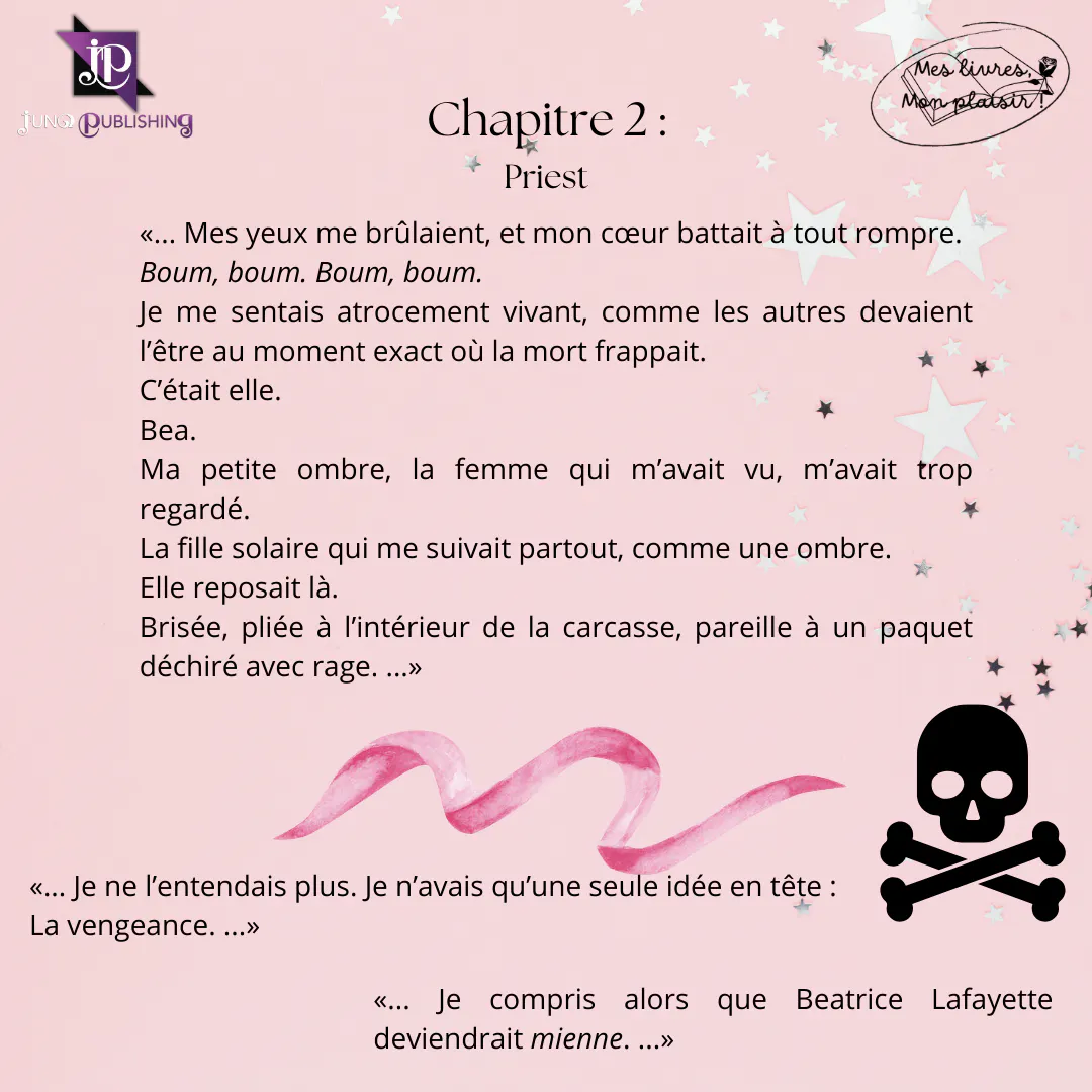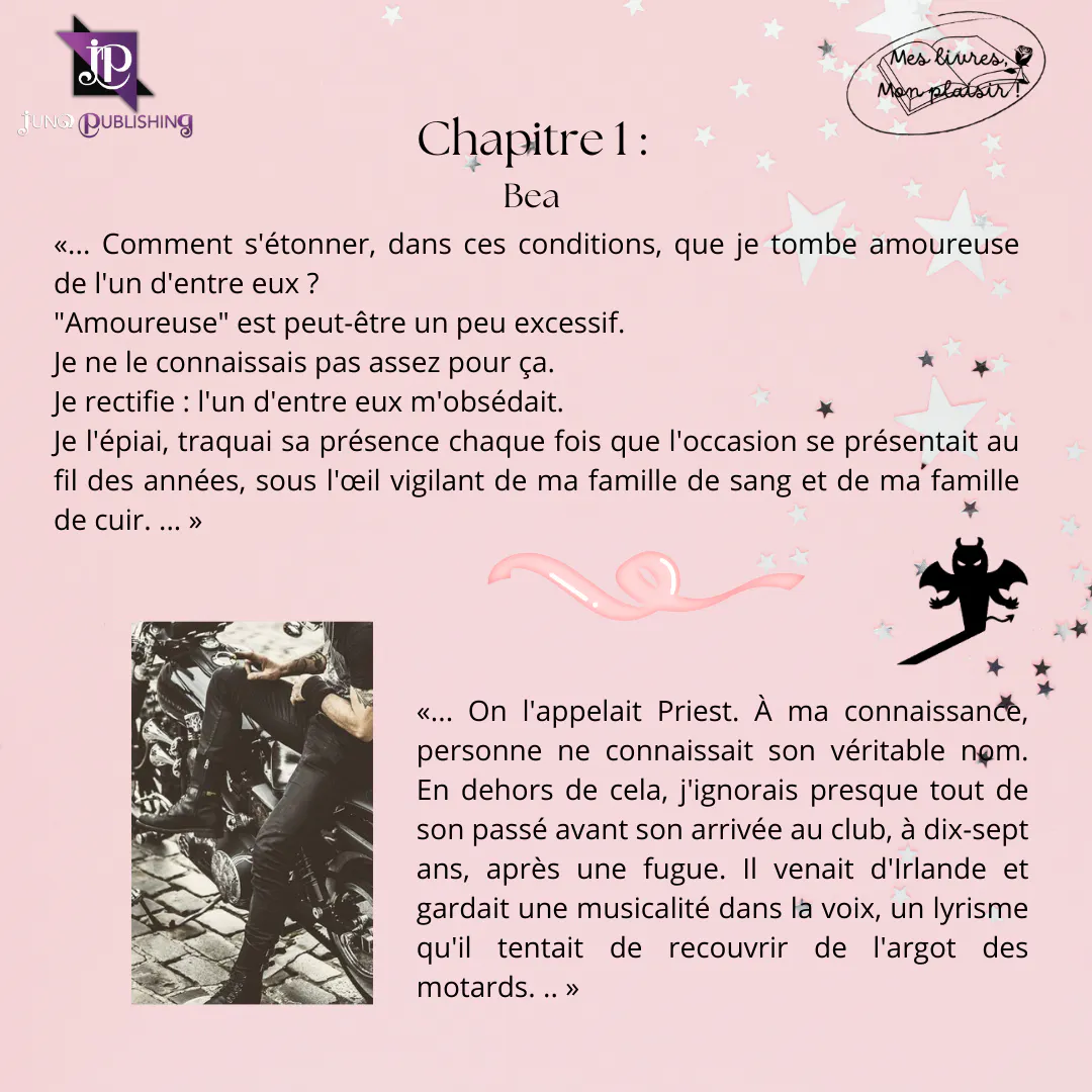 Romance Dark, limites de l’amour repoussées, fascination et obsession, tueur en série, psychopathes, bikers, une histoire sombre et rose... L’auteure nous offre un tome attendu, parfait pour notre Priest. Une enquête et une vengeance très attrayantes en second plan, derrière un couple attachant et pourtant peu conventionnel. Une saga magnifique pour les fans de Smut, de bikers durs à l’extérieur et tendre à l’intérieur avec leurs limites...