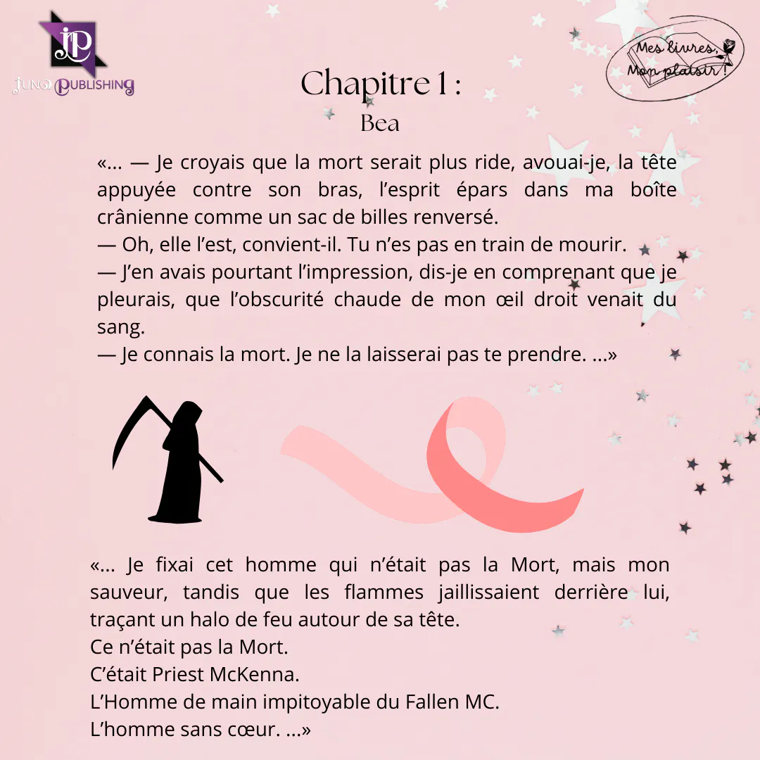 Les émotions sont excellentes. L’auteure nous offre une panoplie de sensations. Bea est une femme voyant la vie en rose, et pourtant elle a une grande part en elle de ténèbres, comme son attirance inexpliquée pour la violence et l’immoralité. Priest recueilli par Zeus à ses dix-sept ans, reste toujours aussi solitaire au cœur de sa famille Fallen. Sa rencontre avec Bea, lui ouvre une porte inconnue sur ses sentiments, et lui apporte une certaine vulnérabilité par ses émotions ressenties. Un tome qui repousse les limites de l’amour. Leurs relations intimes sont très sensuelles avec un langage cru, des scènes très poussées, attention public averti.